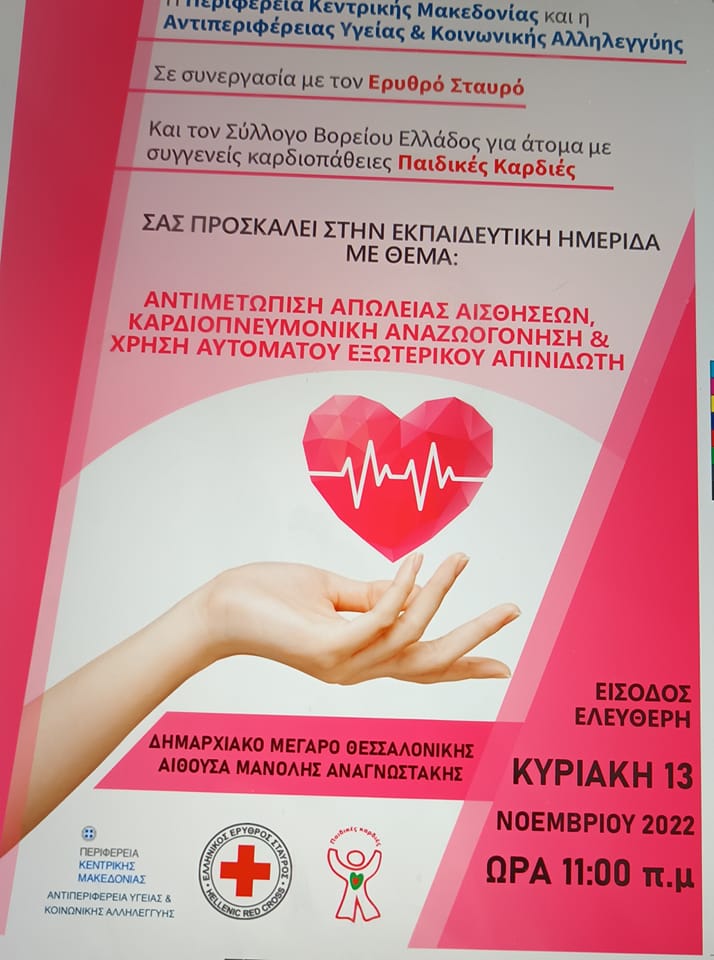Στιγμιότυπα από την Θεματικό Εκπαιδευτικό Σεμινάριο Καρδιοπνευμονικής Αναζωογόνησης & χρήσης εξωτερικού αυτόνομου απινιδωτή που διεξήχθη στις 13 Νοεμβρίου 2022 στην Αίσουσα “Μανόλης Ανασταγνωστάκης” Δημαρχιακού Μεγάρου Θεσσαλονίκης. Συνεργασία Σύλλογος Παιδικές Καρδιές Β. Ελλάδος , Αντιπεριφέρεια Υγείας & Κοινωνικής Αλληλεγγύης, Ελληνικός Ερυθρός Σταύρος. https://www.facebook.com/watch/?v=1320123712124065 https://www.facebook.com/paidikeskardies/videos/836440354144083/ https://www.facebook.com/watch/?v=1056369892426941 https://www.facebook.com/watch/?v=904909710677301 https://www.facebook.com/watch/?v=885198356148406 https://www.facebook.com/paidikeskardies/posts/pfbid02pr7YjZDtXFu4fEnMPx6g7w4FSP4AruwdtHrztDyUsmut6RZuvoYXJ5Qy2BaKT1tgl
